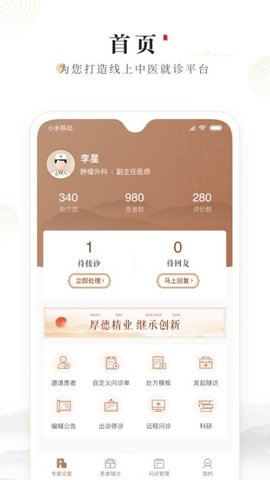 豫中一医生一款专门针对医生线上服务的专业医疗服务平台,它集成了医生的接诊管理、患者在线问诊、电子病历存储、处方流转和医患沟通等功能,适用于日常健康咨询、常见病初步诊断、慢性病随访。让彼此需求得到了有效满足,促进了双方的紧密合作与沟通。