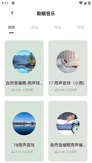 2、各种类型的助眠音乐任你播放,收录了超多自然声音,有助于冥想和放松;