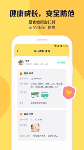 4、在【用药委托详情】中,家长可提交孩子的用药申请,上传药品照片并备注,系统会生成用药记录,保障孩子用药安全。