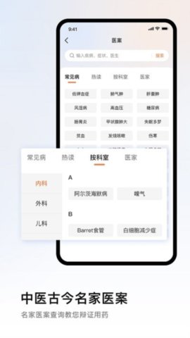 支持按医家查询,按科室分类查询提供症状、脉象、舌相等。