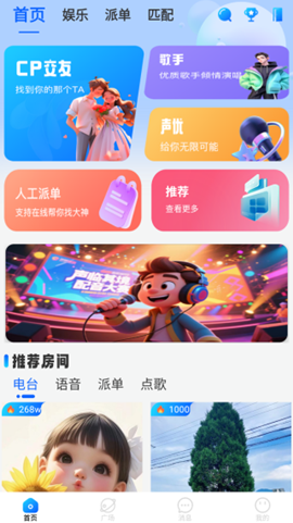 3、进入首页,有超多交友功能,还有电台、语音交友和点歌功能,趣味十足。