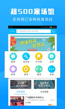 2、选择你要运动的项目,挑选附近场馆,这里你需要注意该场馆是否为惠民场馆,因为平台上带有“惠”字标识的惠民场馆才能使用运动优惠券订场。