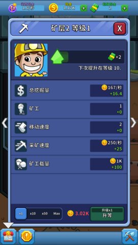 采矿大亨一款模拟采矿的经营模拟游戏,在游戏里将扮演一位矿山经理,通过雇佣超级经理主管和黄金矿工,采掘更多的金矿,提升自己的财富。而且,玩家还可以升级自己雇佣的经理和矿工等级、仓库等级、电梯等级、矿层等级等,将自己的金矿发展成为超级大矿。