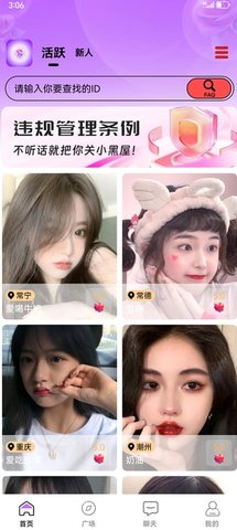 拥有广场板块,可按活跃、新人标签快速找到感兴趣人。