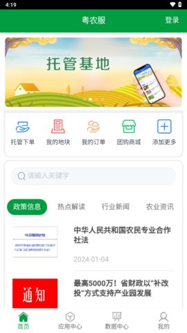 粤农服集成了农业服务的交易功能和生产基地的管理,实现了对订单状态的实时追踪,并及时推送行业热点、政策解读及专业资讯,帮助您快速了解市场动态。精准的数据呈现让您轻松掌握决策要点,从而让您的生产管理更加便捷高效。