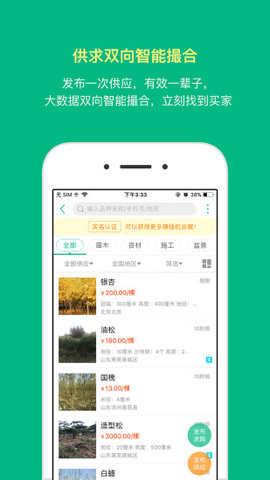 汇农天下一款园林行业综合交易服务平台,在促进上下游信息撮合与资源共享。专注于绿化苗木、园艺盆景、园林施工、农林资材全产业链的生态重塑。汇农天下支持商机智能匹配和即时推送,提供诚信担保支付等服务,以实现便捷、安全、高效的交易。