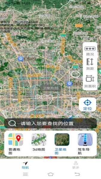 在主界面底部选择普通/3D/卫星任一图层;卫星视图更适合识别地形与建筑物。