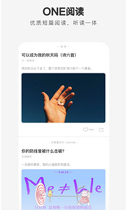 one阅读平台一款提供大量阅读资源平台,将阅读变成一种生活方式,包含各个阅读方式、文字、音频,视频等方式进行阅读。随时都能开启阅读,海量短篇文章资源,满足不同用户兴趣要求。one阅读平台资源频繁的更新,随时都能获得最新资源,下面一起来看看相关的信息。