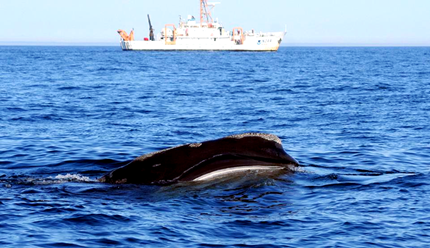 露脊鲸头部较大,行动迟缓,喜欢栖息于水面上层,头部经常隐没在海面下,把光滑的背部露出水面,出水呼吸时也是先露出脊背,再露出头部,"露脊鲸"的名称由此而来。